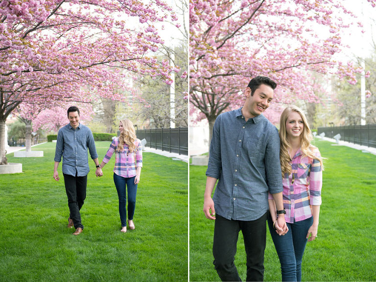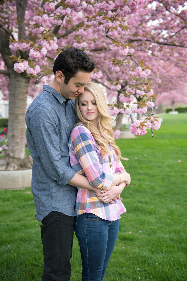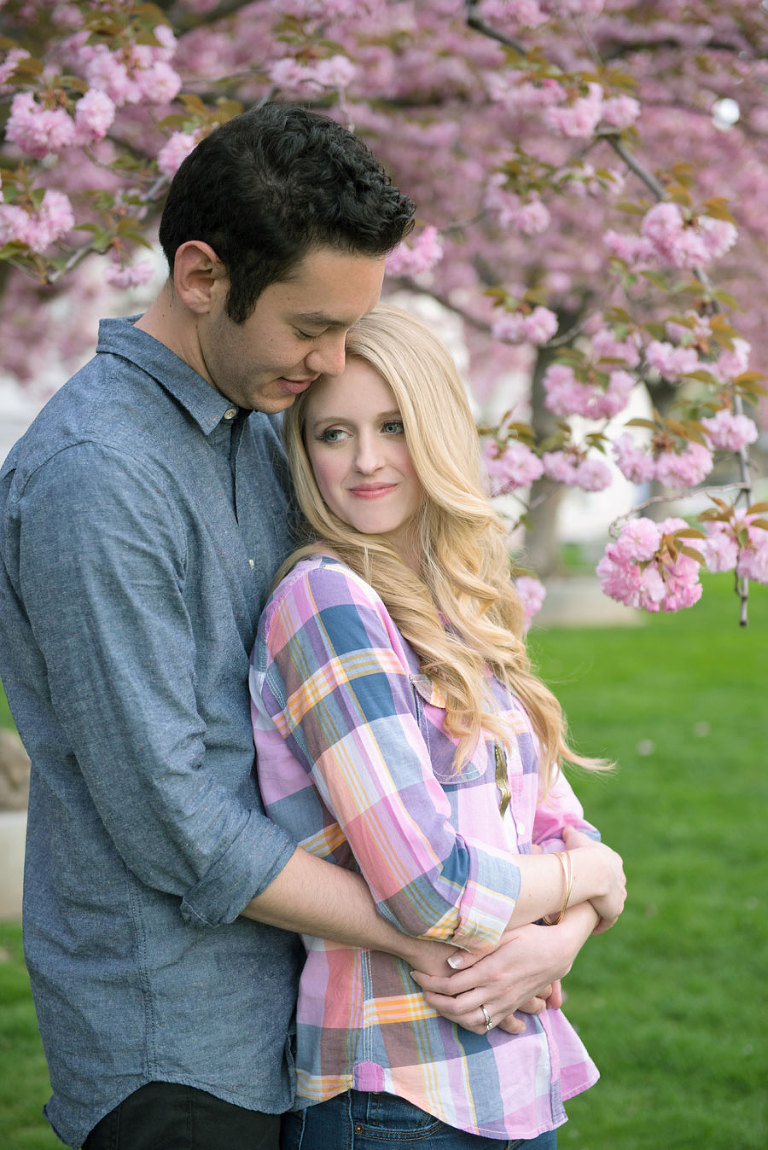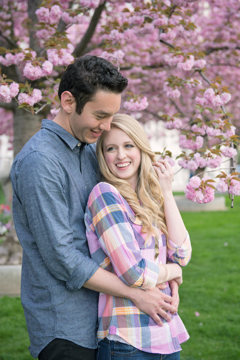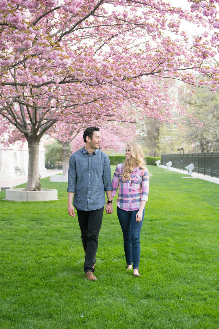 I loved spending the evening with these two while shooting their engagement photos. Jared and Brittany have such a fun relationship and are so sweet to eachother. I was excited when they choose to have their engagement session downtown but we were all even more thrilled when we found out the blossoms were in full bloom the day of the shoot. The timing couldn’t have been more perfect. .jpg)