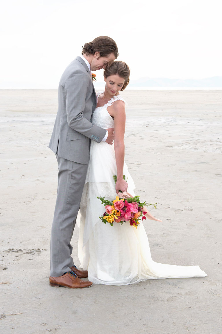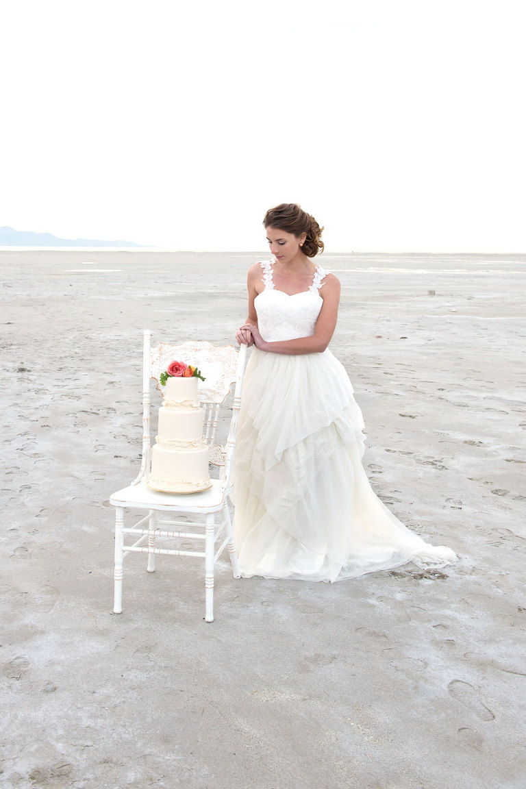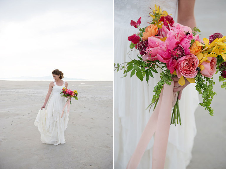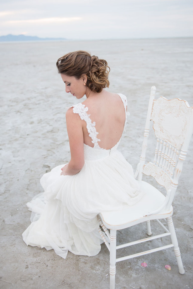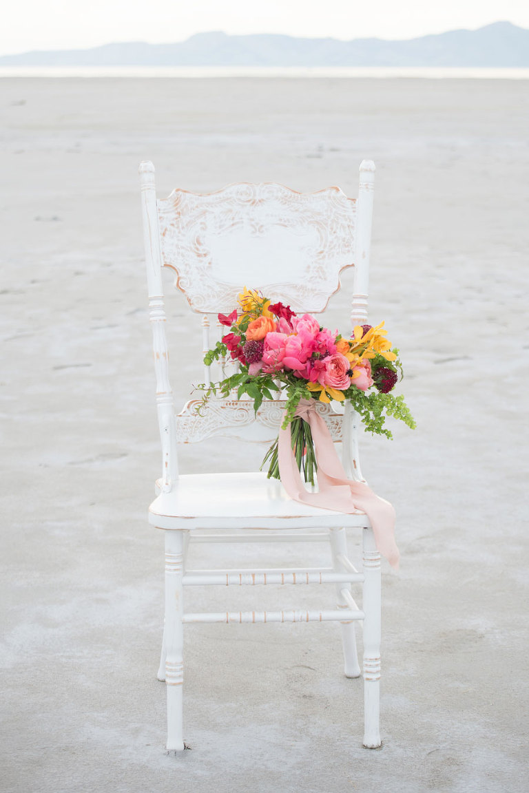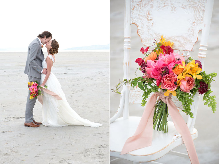 The inspiration for this shoot stems from a colorful floral design including antike roses, orchids, sweet pea cosmos and coral charm peonies. These beautiful blooms were the perfect complement for the Chantel Lauren designed wedding gown. We loved the free flowing layers of Swiss dot netting and floral lace top. These details came together to create a whimsical styled look that gets us excited for summer wedding bliss. The setting for this shoot takes place at the wide open salt flats located in Magna, Utah. The simplistic beauty of this location provides a wide open setting that allows the rich floral design to stand out and create a magical atmosphere.