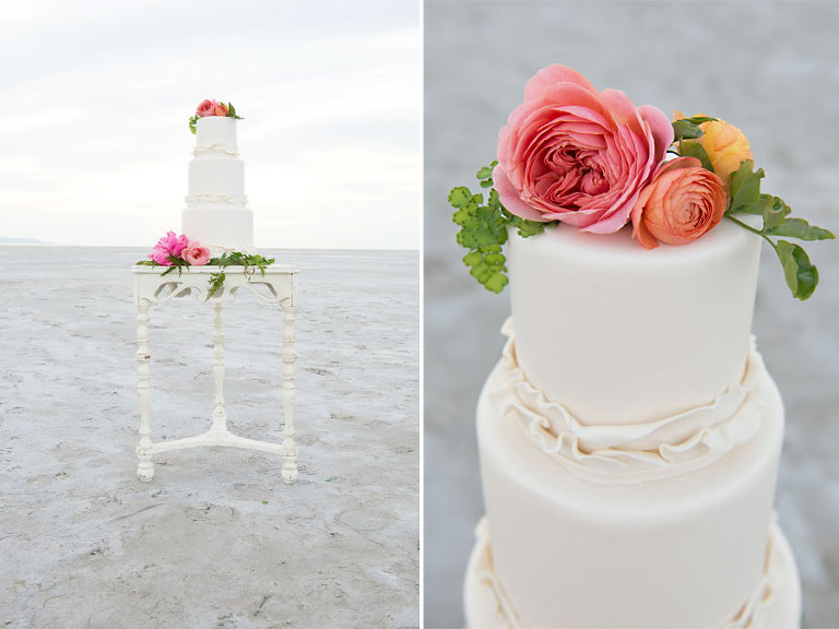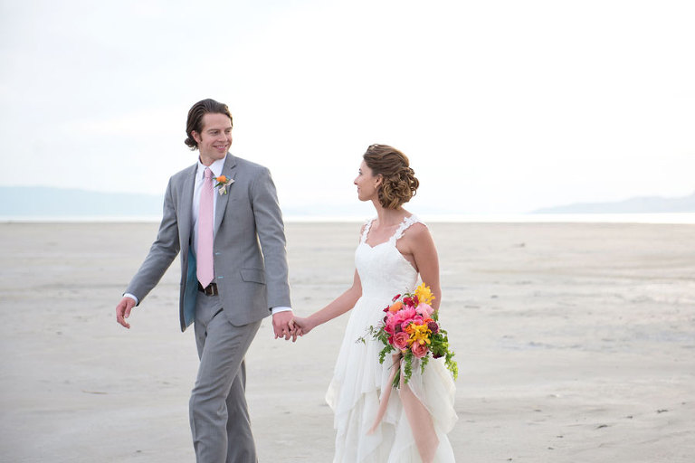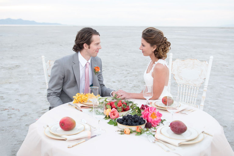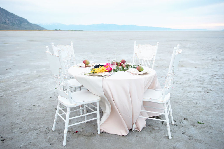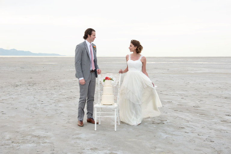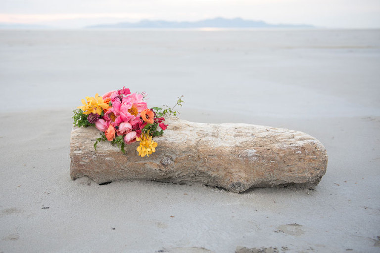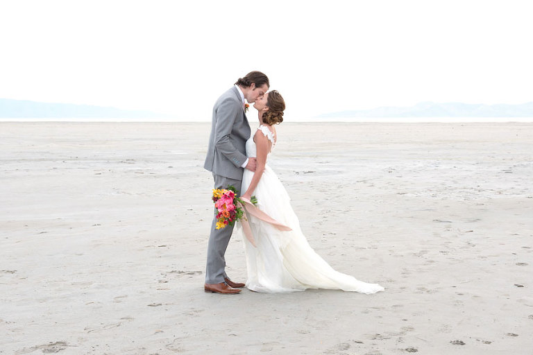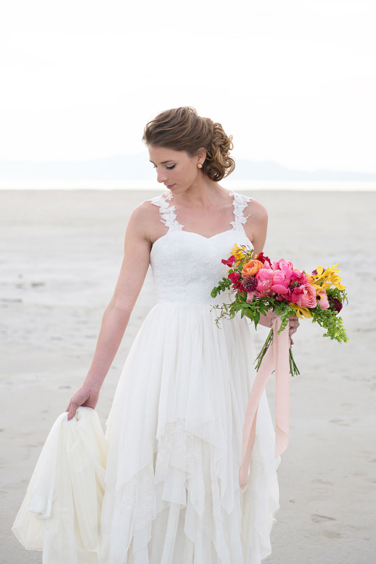 The inspiration for this shoot stems from a colorful floral design including antike roses, orchids, sweet pea cosmos and coral charm peonies. These beautiful blooms were the perfect complement for the Chantel Lauren designed wedding gown. We loved the free flowing layers of Swiss dot netting and floral lace top. These details came together to create a whimsical styled look that gets us excited for summer wedding bliss. The setting for this shoot takes place at the wide open salt flats located in Magna, Utah. The simplistic beauty of this location provides a wide open setting that allows the rich floral design to stand out and create a magical atmosphere.