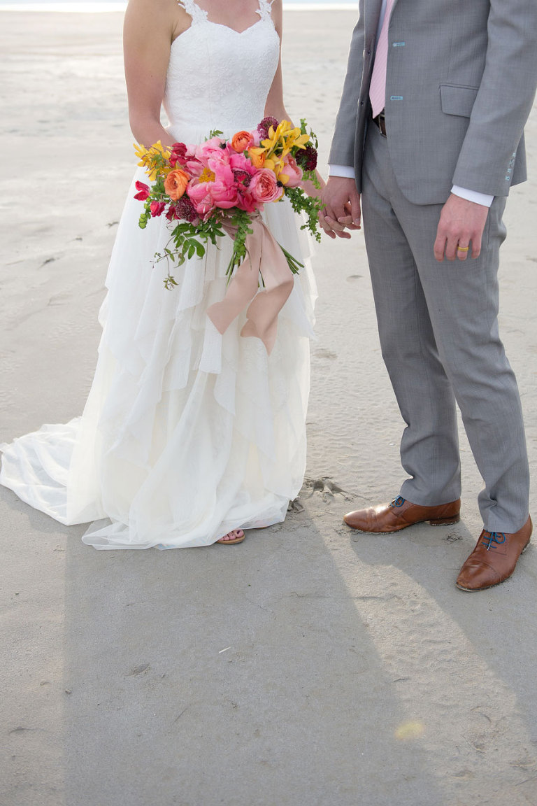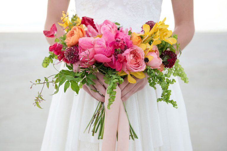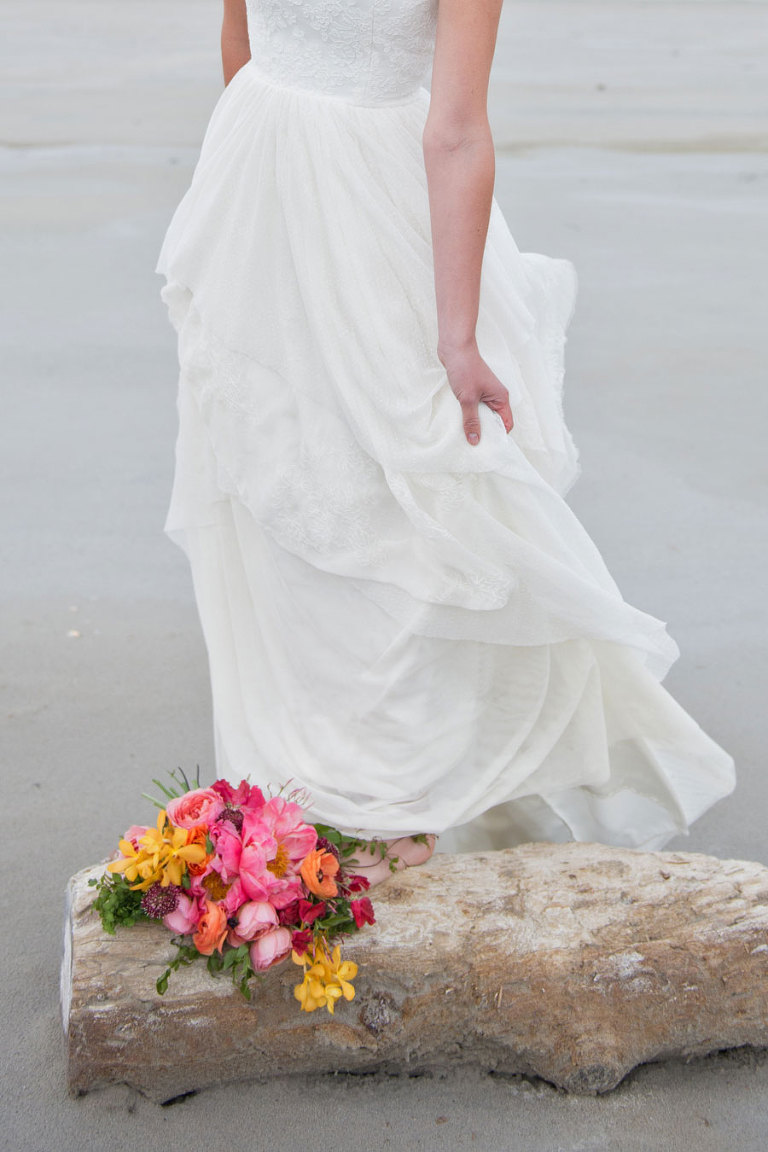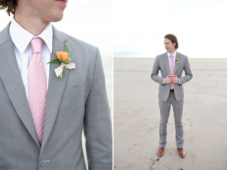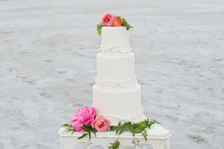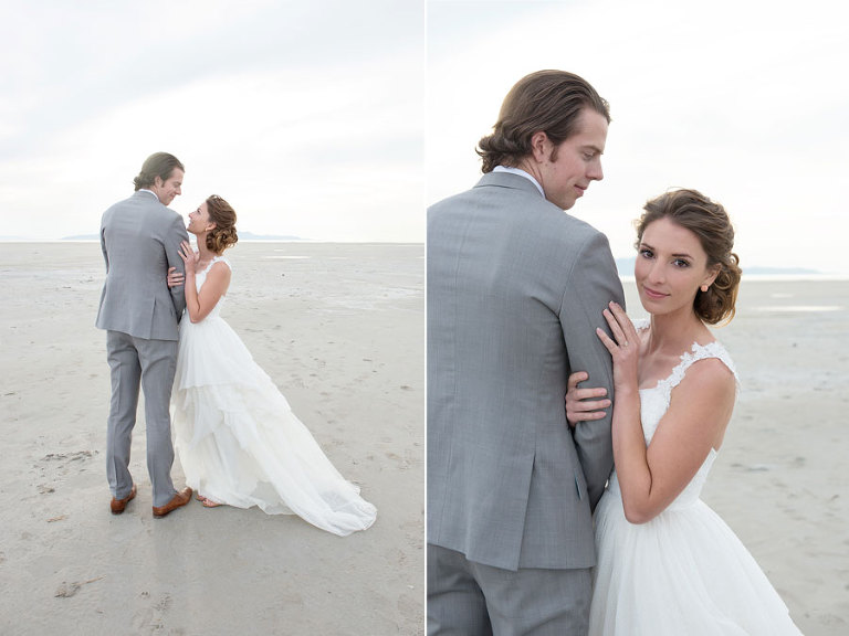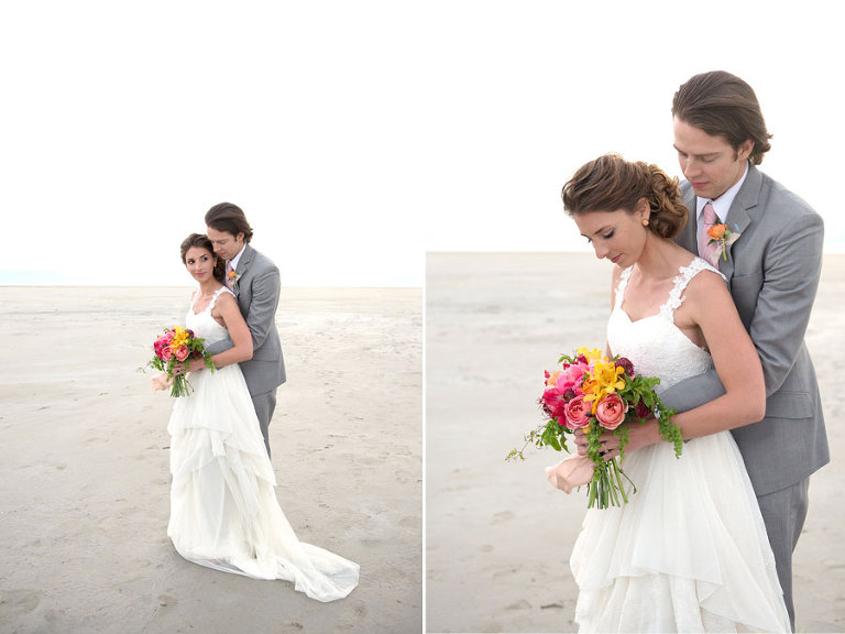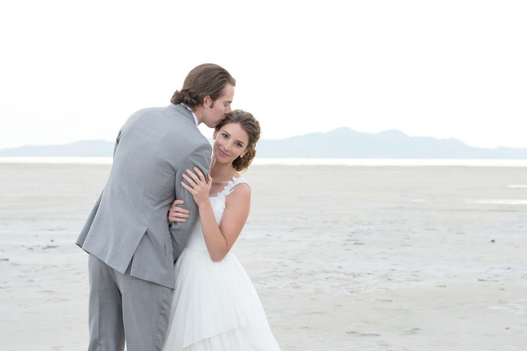 The inspiration for this shoot stems from a colorful floral design including antike roses, orchids, sweet pea cosmos and coral charm peonies. These beautiful blooms were the perfect complement for the Chantel Lauren designed wedding gown. We loved the free flowing layers of Swiss dot netting and floral lace top. These details came together to create a whimsical styled look that gets us excited for summer wedding bliss. The setting for this shoot takes place at the wide open salt flats located in Magna, Utah. The simplistic beauty of this location provides a wide open setting that allows the rich floral design to stand out and create a magical atmosphere.